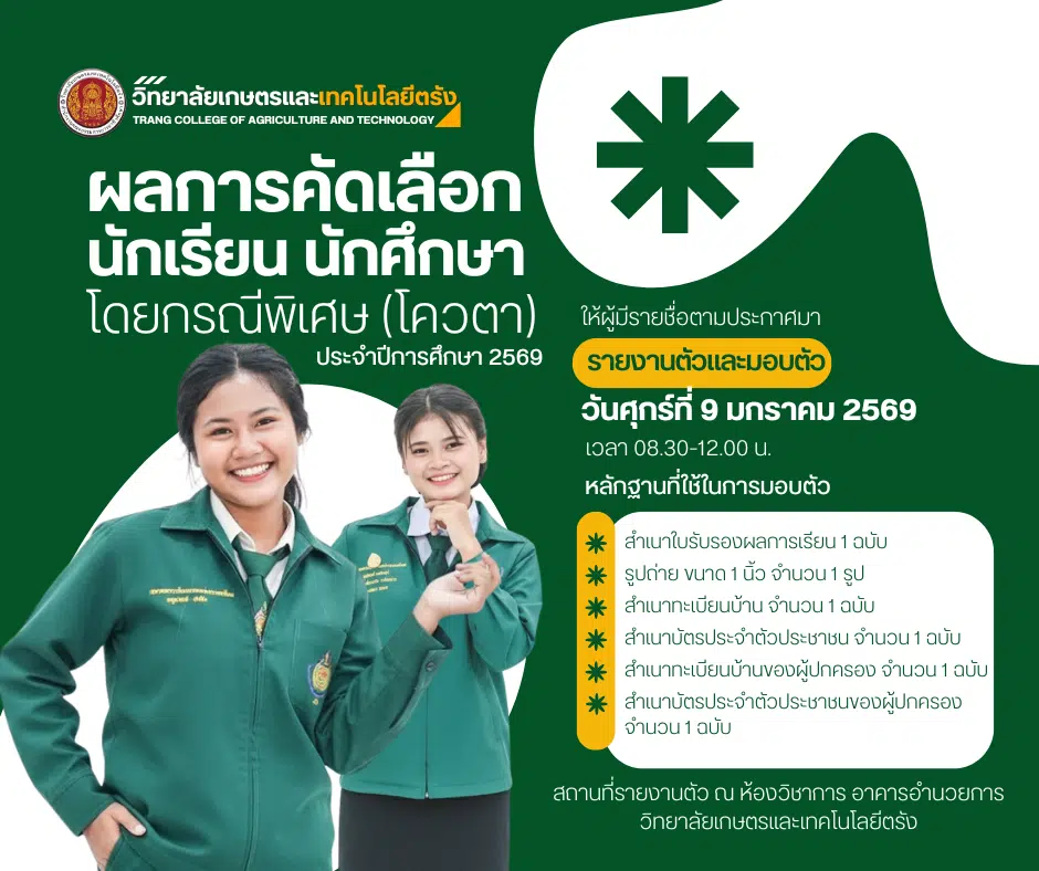 ข่าวนักเรียน นักศึกษา การจัดการเรียนการสอน ลดเวลาเรียน เพิ่มเวลารู้ ประกาศวิทยาลัยเกษตรและเทคโนโลยีตรัง เรื่อง การจัดการเรียนการสอนลดเวลาเรียน เพิ่มเวลารู้...อ่านเพิ่มเติม 31 ตุลาคม 2025ข่าวนักเรียน นักศึกษา