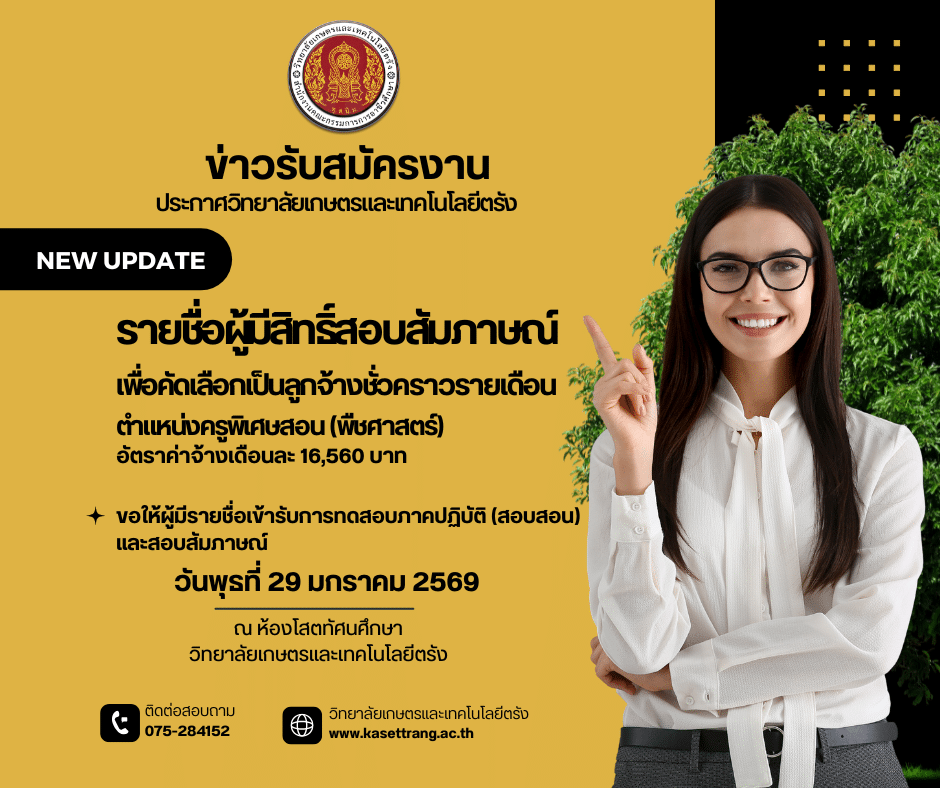 ข่าวรับสมัครงาน ประกาศรายชื่อผู้มีสิทธิ์สอบสัมภาษณ์เพื่อบรรจุคัดเลือกเป็นลูกจ้างชั่วคราว ตำแหน่ง ครูพิเศษสอน (พืชศาสตร์) ประกาศวิทยาลัยเกษตรและเทคโนโลยีตรัง เรื่...อ่านต่อเพิ่มเติม>> 28 มกราคม 2026ข่าวรับสมัครงาน